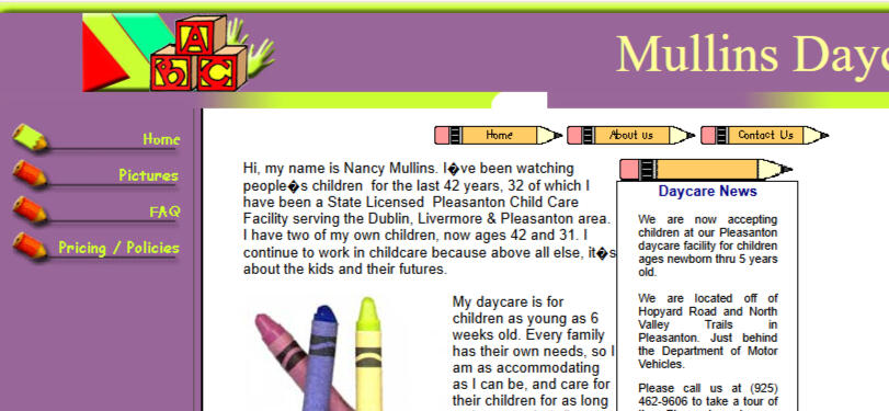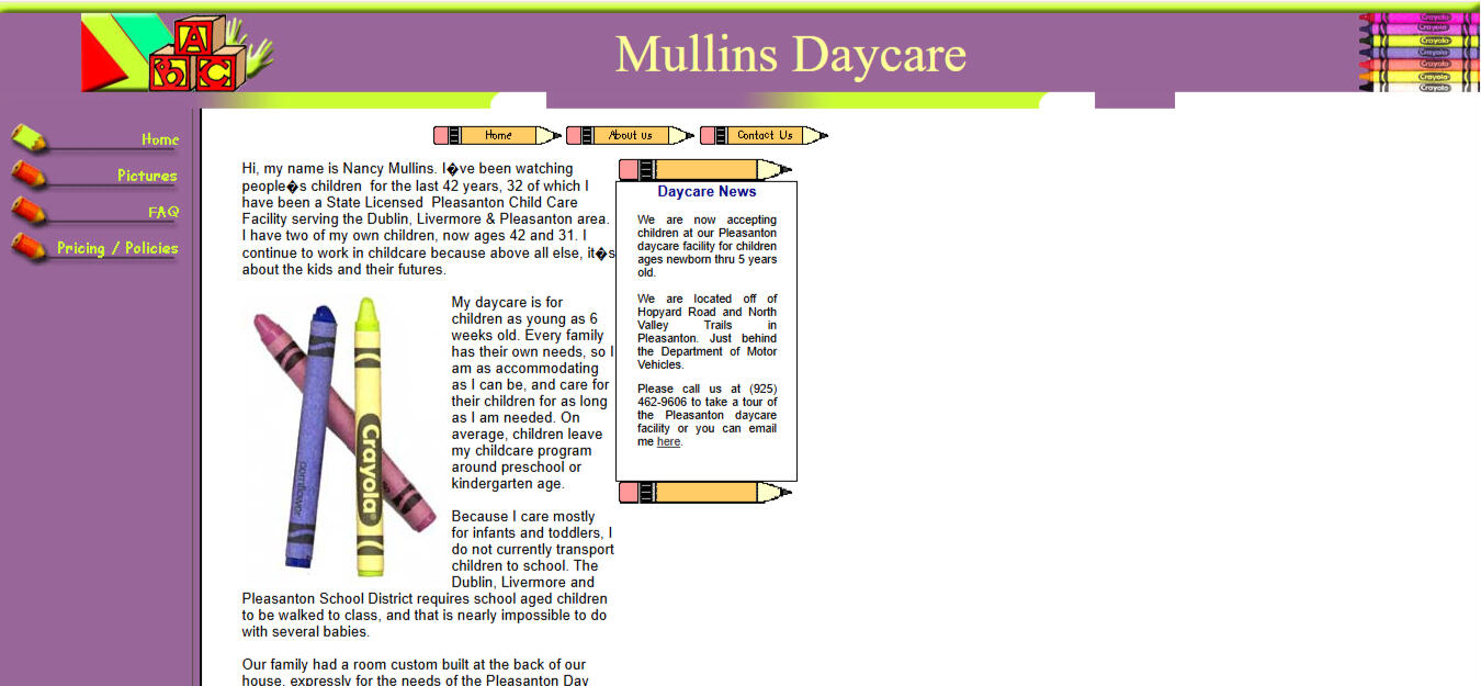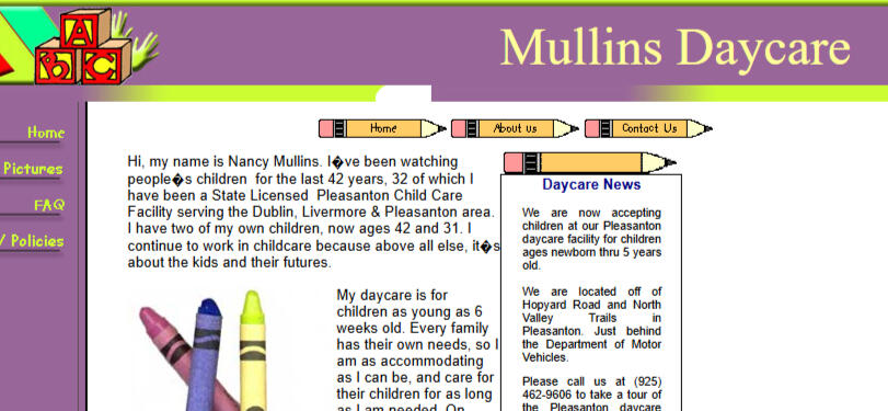 Hi, my name is Nancy Mullins. I�ve been watching people�s children for the last 42 years, 32 of which I have been a State Licensed Pleasanton Child Care Facility serving the Dublin, Livermore & Pleasanton area. I have two of my own children, now ages 42 and 31. I continue to work in childcare because above all else, it�s about the kids and their futures.